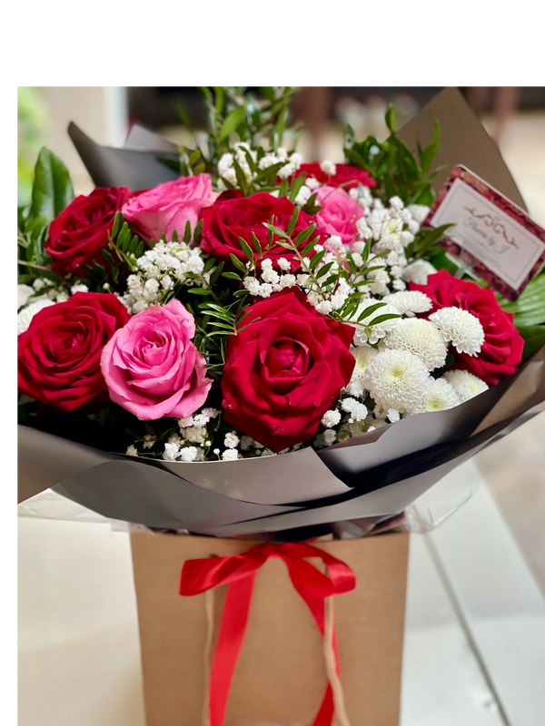 Each bouquet is thoughtfully hand‑tied and presented in a fresh aqua pack, ensuring the flowers stay beautifully hydrated from our studio to their final destination. Every arrangement is finished with a gift bag, making it effortless and delightful to give.